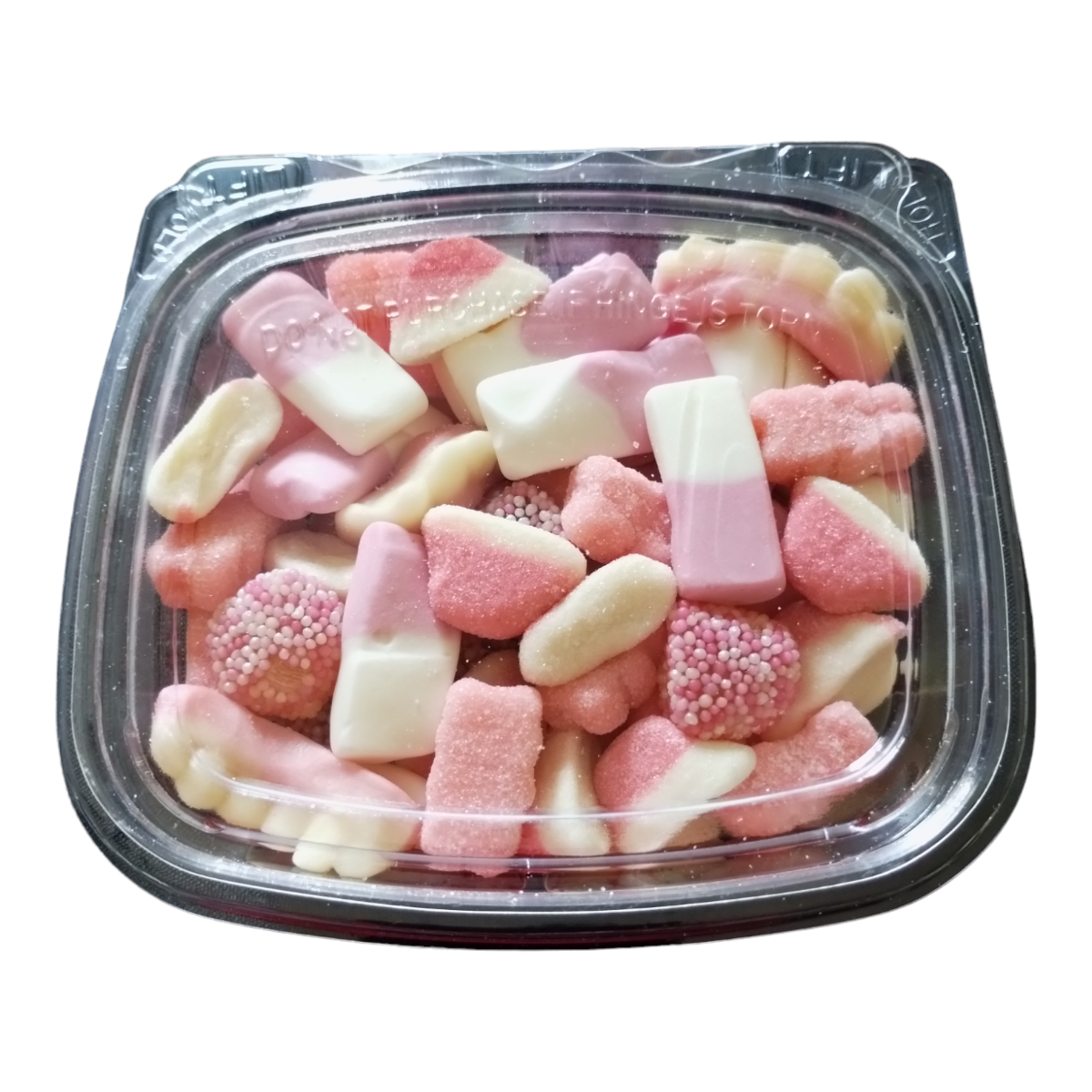 This very pretty pink mix comes with these pre-selected candies: Strawberry cake drops, raspberry squashies, pink crunch berries, teeth (strawberry), Pink watermelon sour bears.